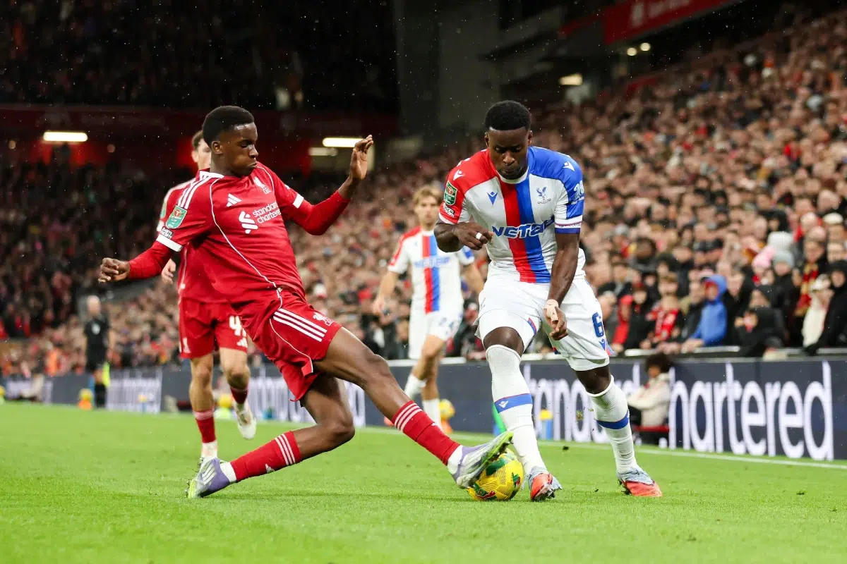 Marc Guehi of Crystal Palace is challenged by Trey Nyoni of Liverpool, 2025