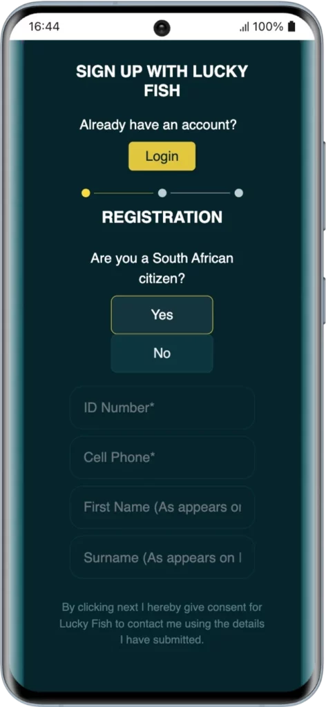 Visit the official Lucky Fish website, click “Join Now,” and provide your South African ID number and mobile details to create your account.